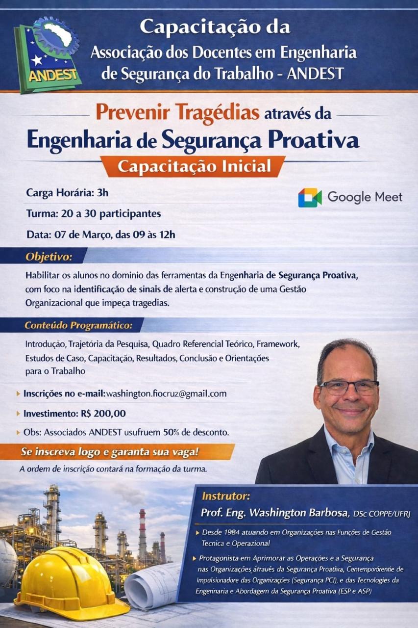 A Associação dos Docentes em Engenharia de Segurança do Trabalho – ANDEST promove a capacitação on-line “Prevenir Tragédias através da Engenharia de Segurança Proativa – Capacitação Inicial”