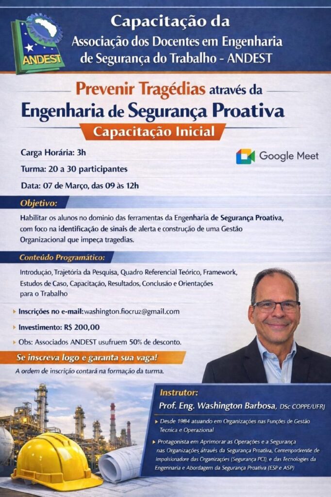 A Associação dos Docentes em Engenharia de Segurança do Trabalho – ANDEST promove a capacitação on-line “Prevenir Tragédias através da Engenharia de Segurança Proativa – Capacitação Inicial”, a ser realizada no dia 07 de março, das 09h às 12h, com carga horária de 3 horas e turmas limitadas a 20 a 30 participantes.